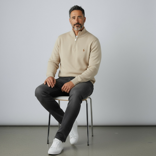 Πλεκτή μπλούζα polo με μισό φερμουάρ μπεζ